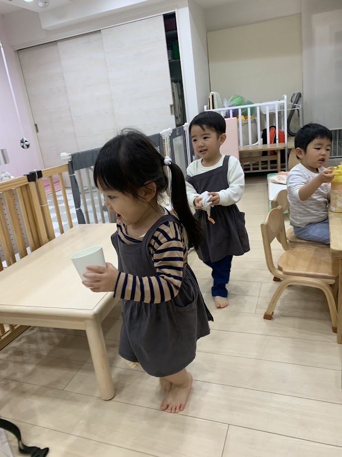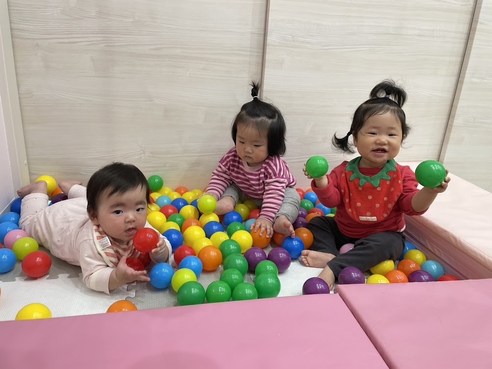1歳児さんは、8名で初めはみんな泣いていたんですが、今では保護者の方とバイバイできたり、