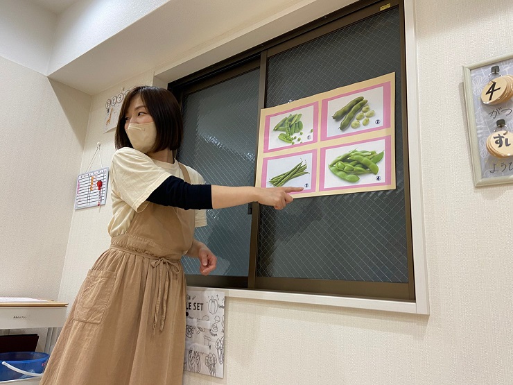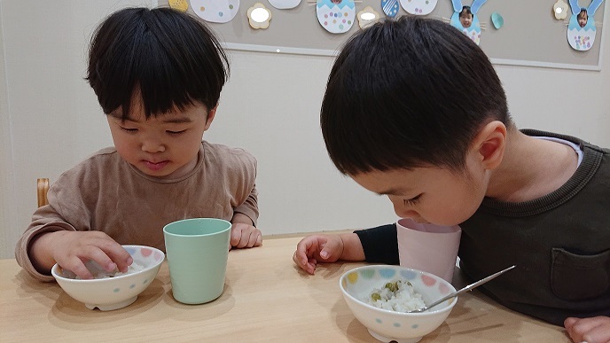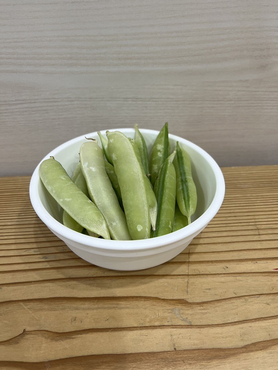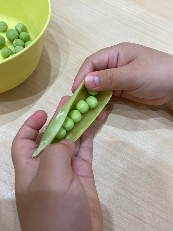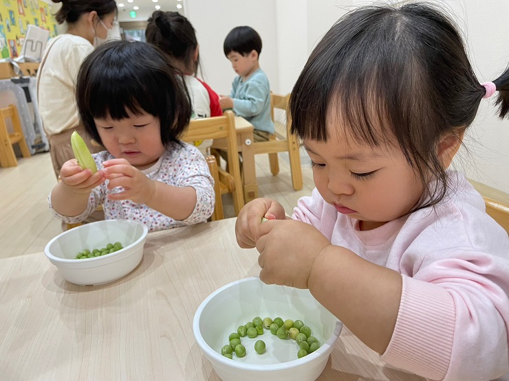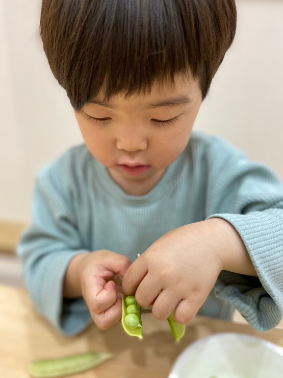 今日は食育でグリーンピースの皮むきをしましたよ😊最初に、グリーンピースについて先生からのクイズ!グリーンピースはどれかな~?その後は、本物のグリーンピースを実際に手に取って触ったり、においをかいだりして観察します😊さやをあけてみると、お豆がいっぱい! みんな上手にお豆をつまんで…お皿の中へ!そして、今日のおやつは豆ごはん!むいたお豆を調理の先生に届けます。「おいしい豆ごはんにしてね♡」お昼寝が終わると、お部屋の中はお豆のいいにおい!みんなでおいしくいただきました♡